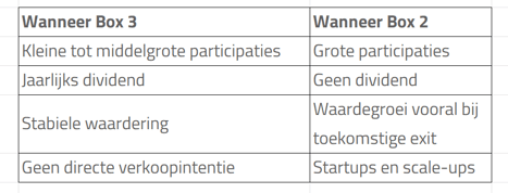 - Alleen bij grote belangen of lange termijn zonder dividend blijft Box 2 soms verstandig.